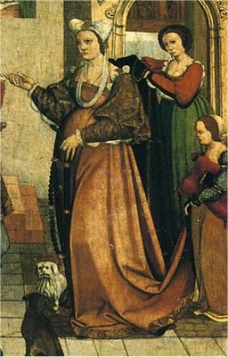One of the things I want to try is a new style of longer sleeve for the 15th century. The image above, the Retablo mayor de San Julián de Ororbia (1539, Navarra), shows both women wearing a pair of sleeves with a large upper sleeve tied on at the shoulders, a very fitted lower sleeve, and the camisa sticking out of the lower sleeve.