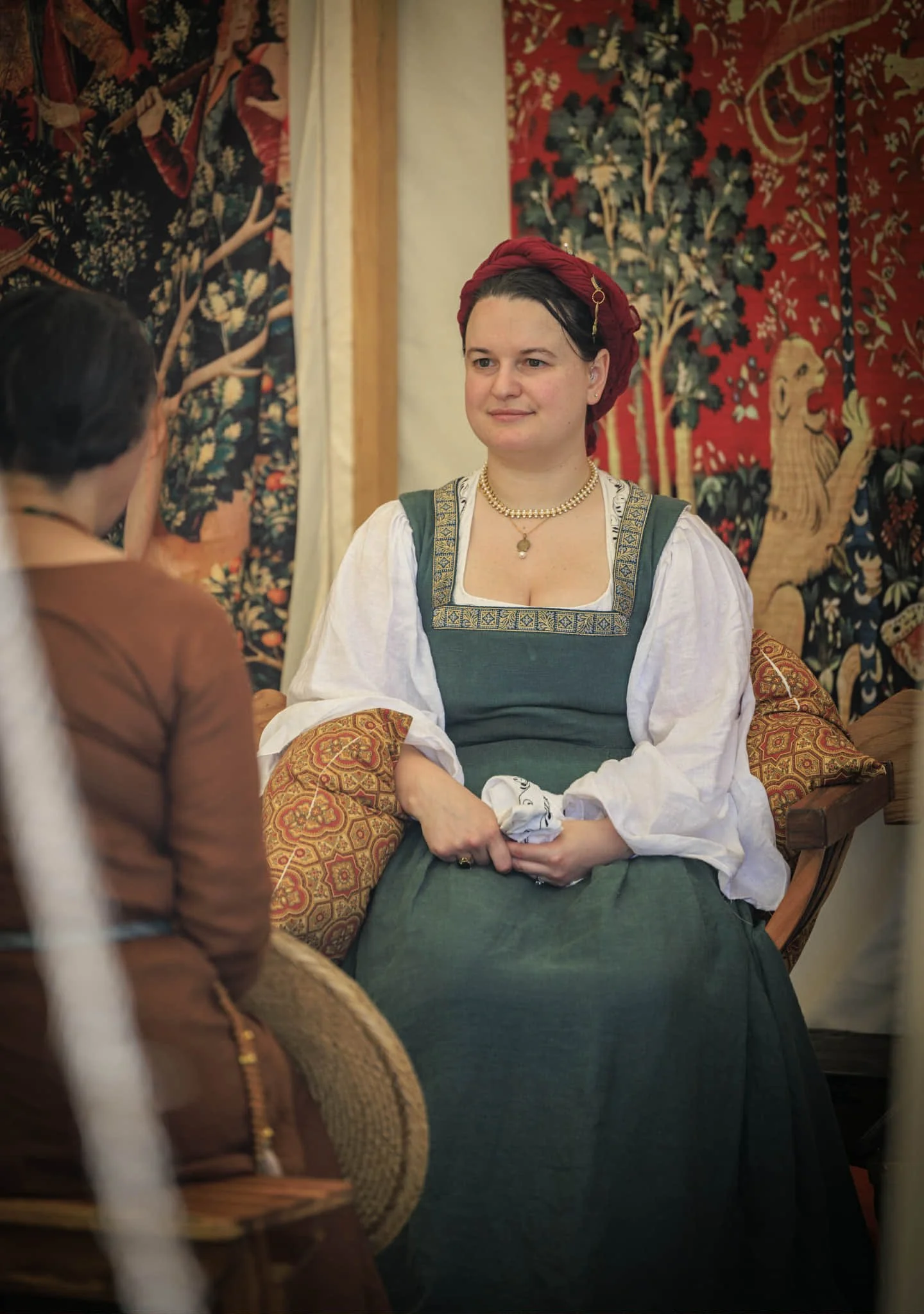 This dress needs sleeves. I did not include them for the sake of heat control at Pennsic, but these will be a future project for this dress.